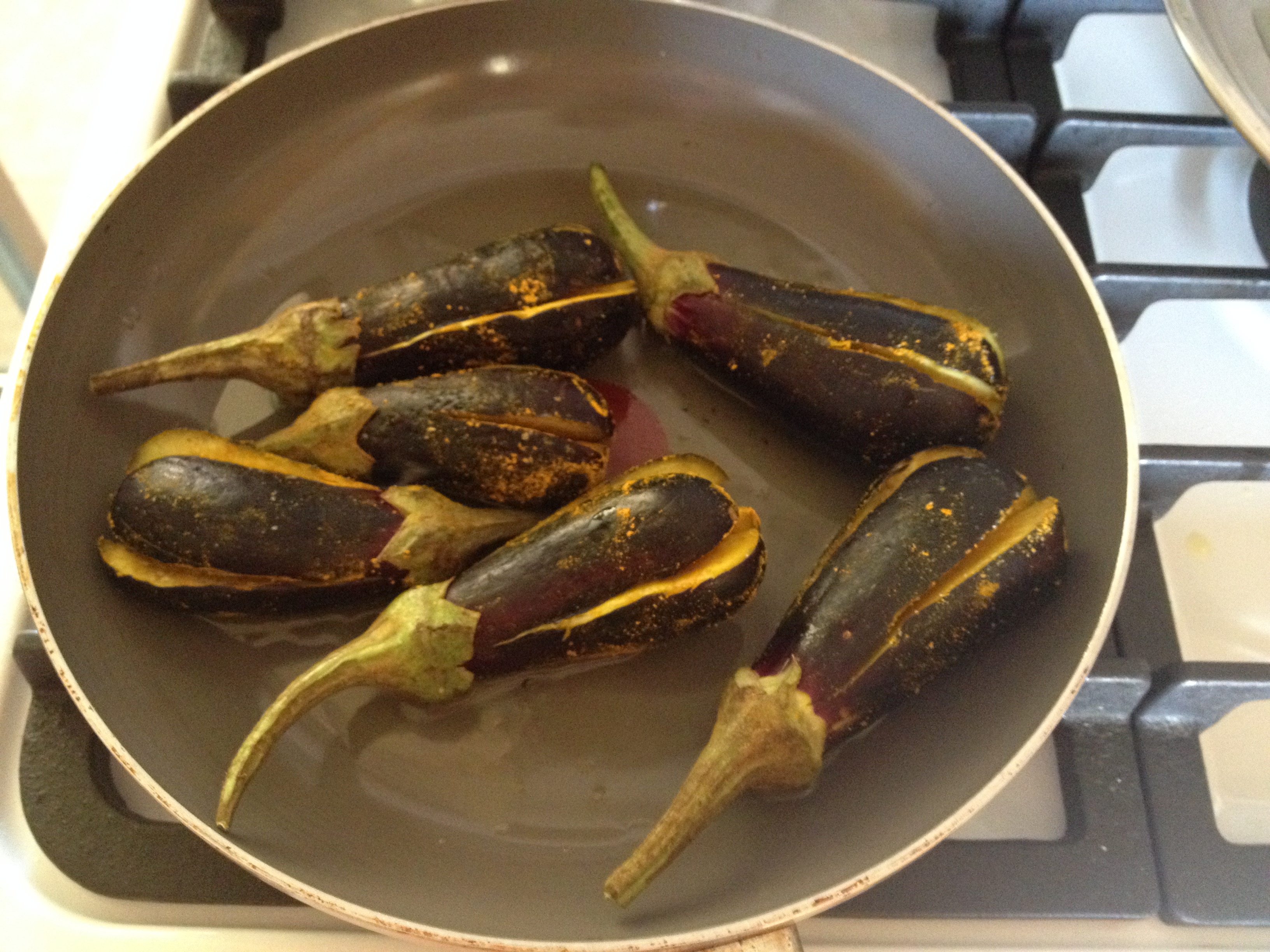 Sprinkle turmeric and salt keep aside. Heat oil in a pan place brinjal in it and cook on medium heat until done.