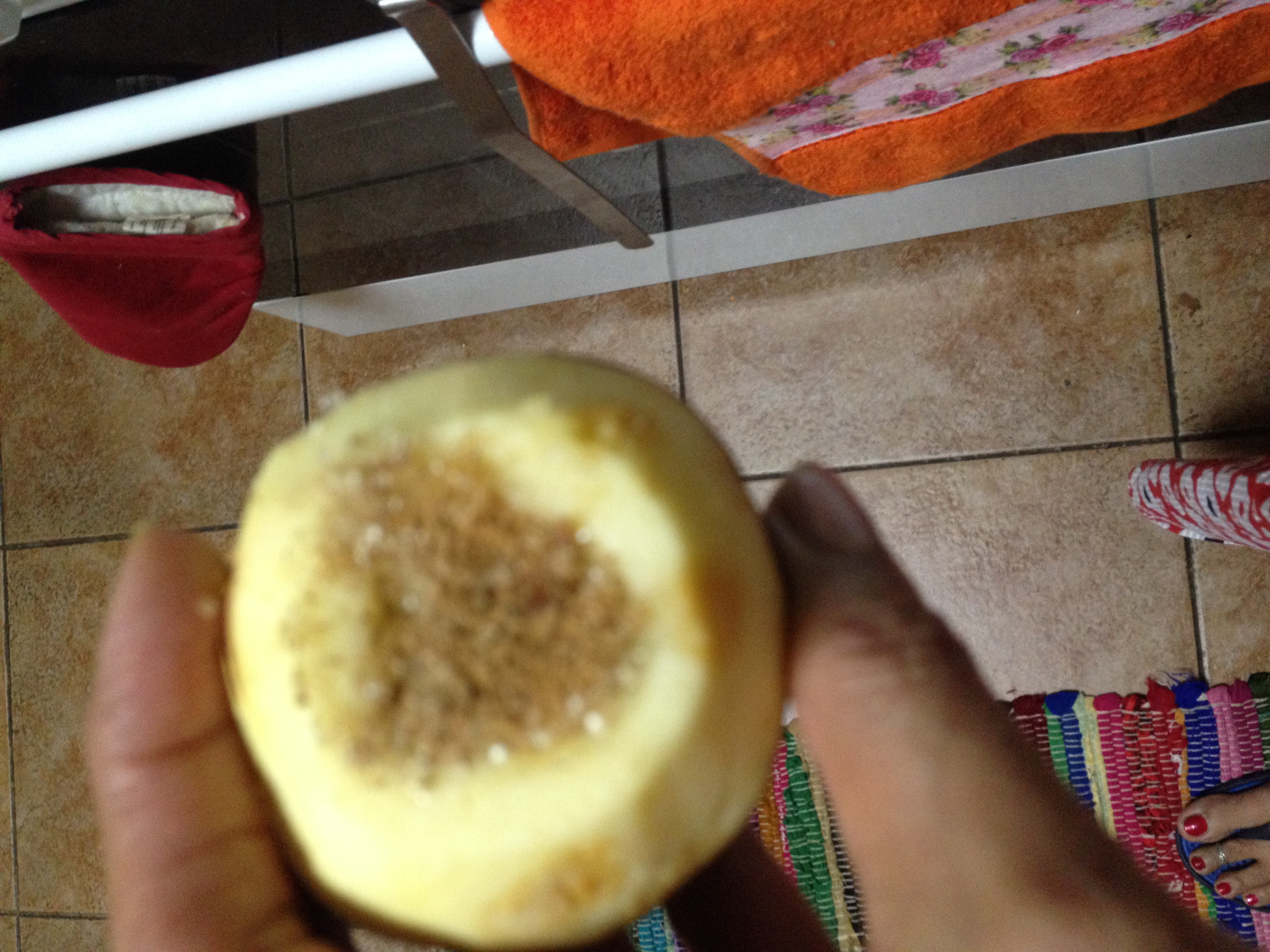 - First wash and dry apple then peel an apple and cut the bottom (stem) area and take out the seeds with the help of the metal spoon, scoop seeds and make the wide hole around 1-inch diameter or so. Now it will be easy to fill…