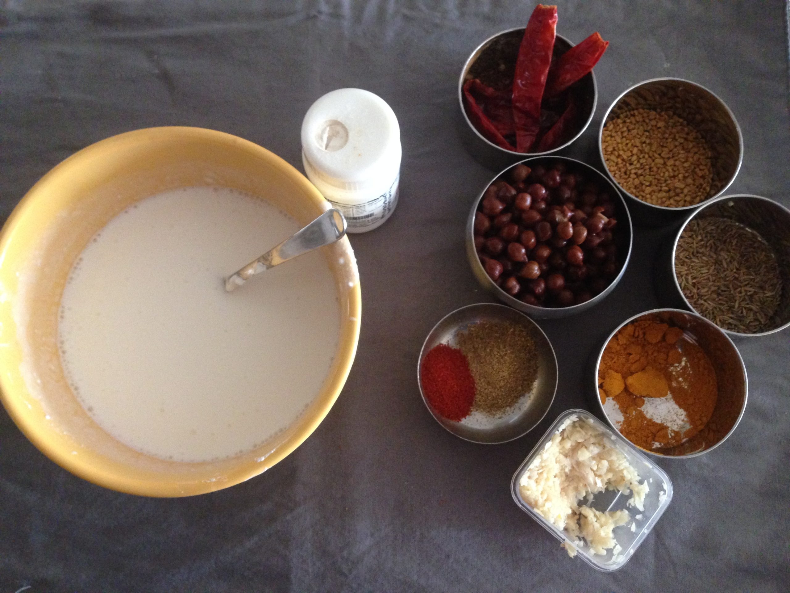 In a large bowl combine add curd, besan, red chilli powder and turmeric powder, coriander powder add water from chana mix well. Make sure there is no lump.