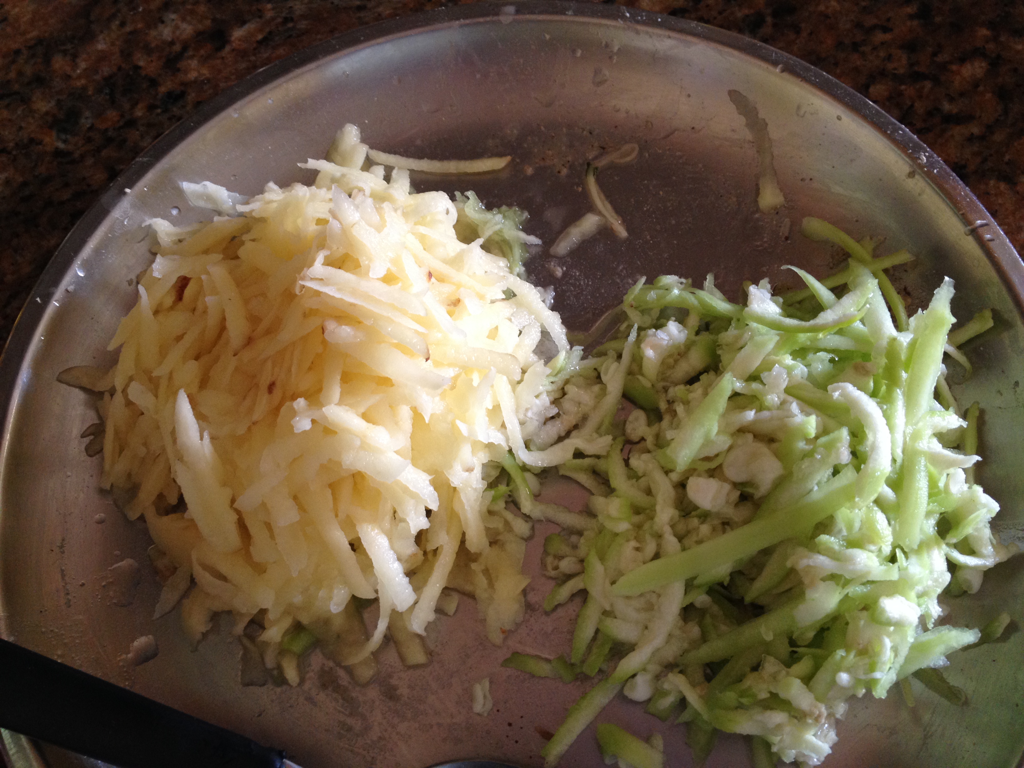 Peel and grated bottle gourd and potato squeeze out water. steam vegetable for 5 minutes in micro or 10 minutes in a steamer. When the vegetable is done keep aside cool.