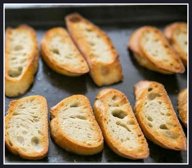 Preheat oven @ 450° F brush one side of each bread with butter and arrange in a baking tray place baking tray on the top and toast until bread become light brown it takes about 4-5 minutes.