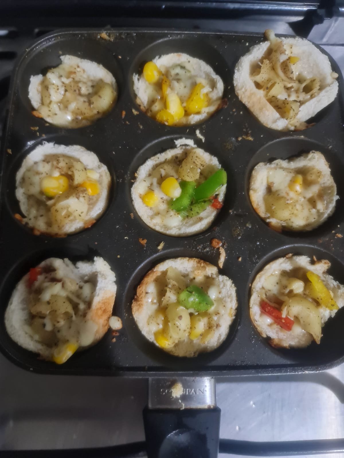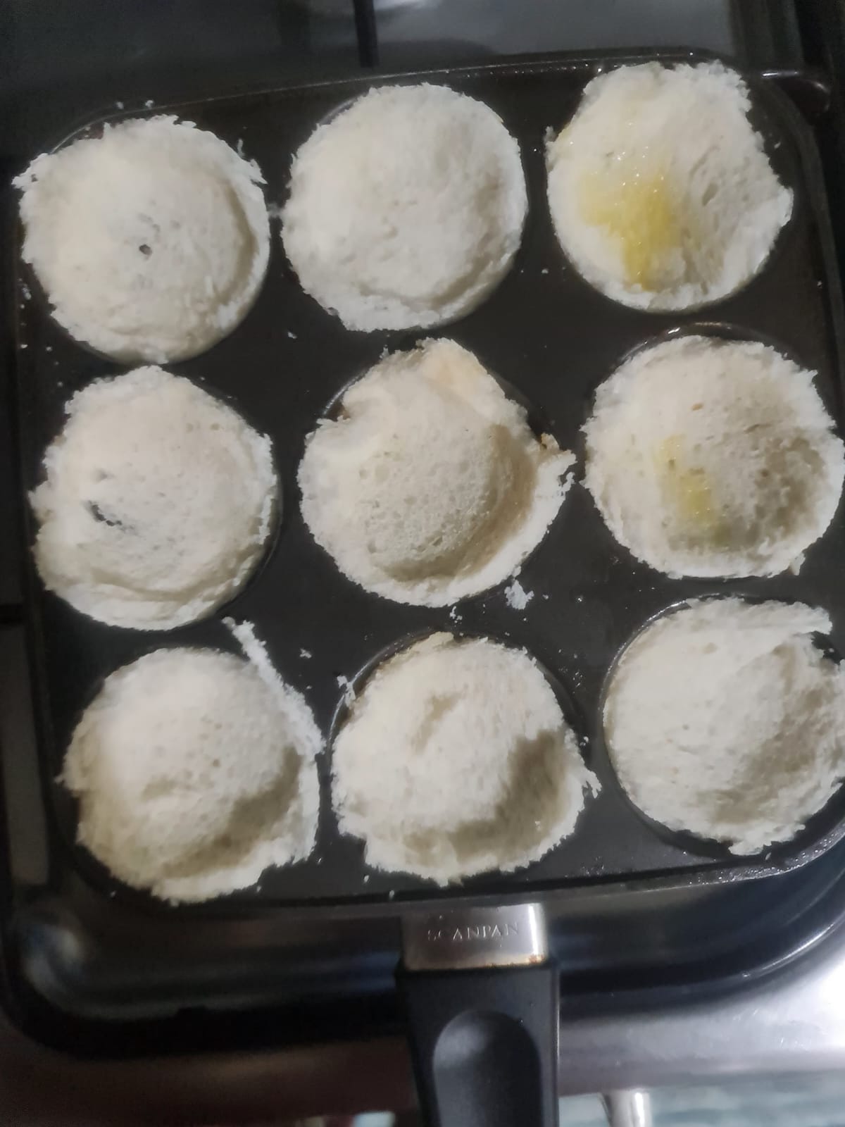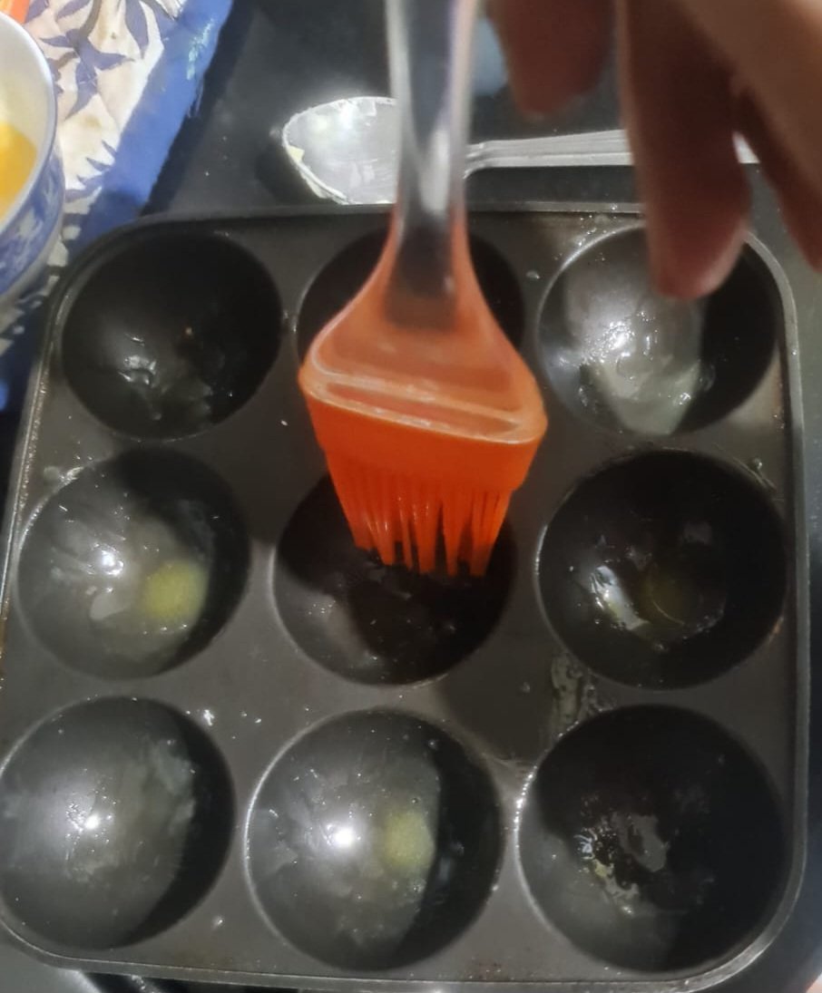 - Keep appe pan on heat and grease with oil or butter on each cavity. Carefully place the rolled bread in each cavity and gently press them to take shape.