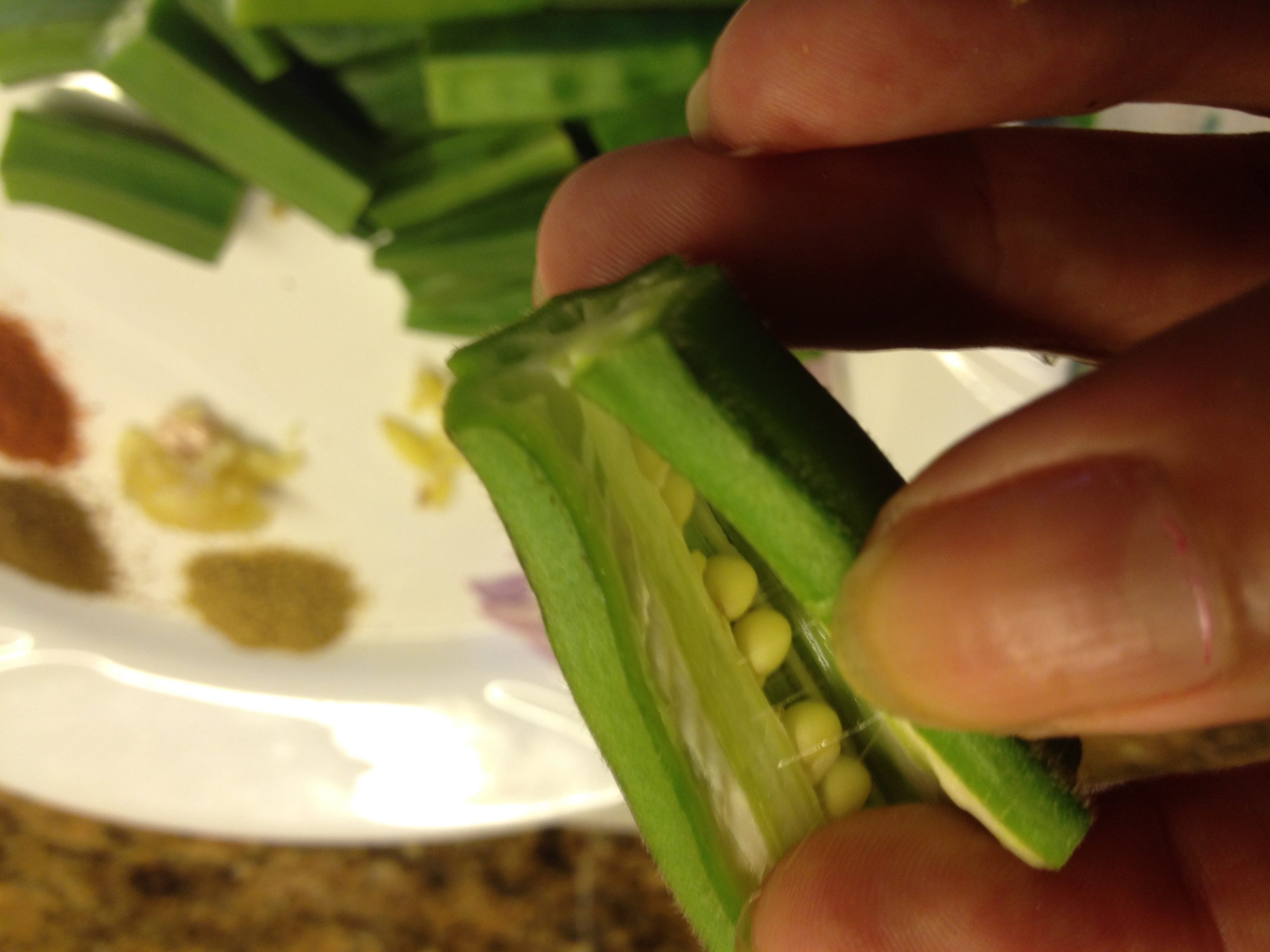 - Wash okra (bhindi) and dry with the cloth. Cut into 2-inch pieces and make a slit for stuffing.