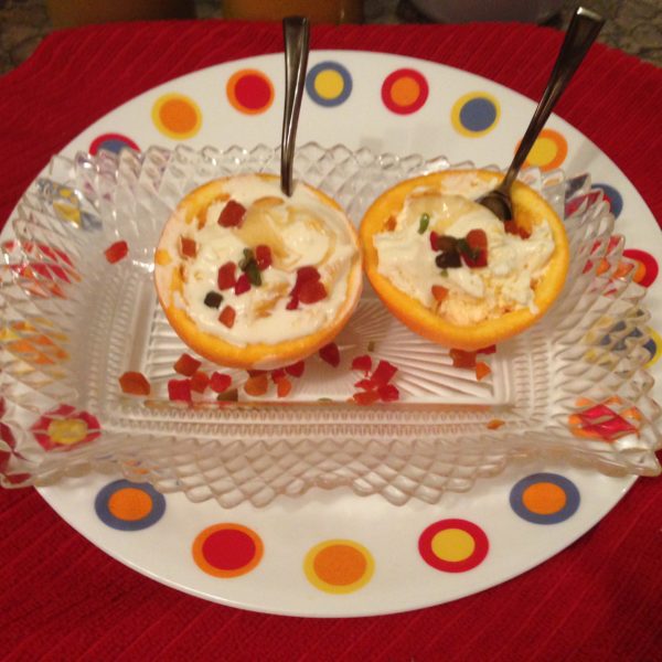 Take out the curd mixture from fridge and fill in the orange halves garnish with orange slice and zest.
