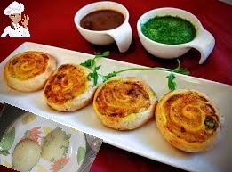 Mix 3 tablespoons flour into ¼ cup water to make a smooth batter, Heat oil in the frying pan over medium heat. Dip the pinwheel in the batter one at a time and fry until both sides become golden brown. Serve with green chutney.
