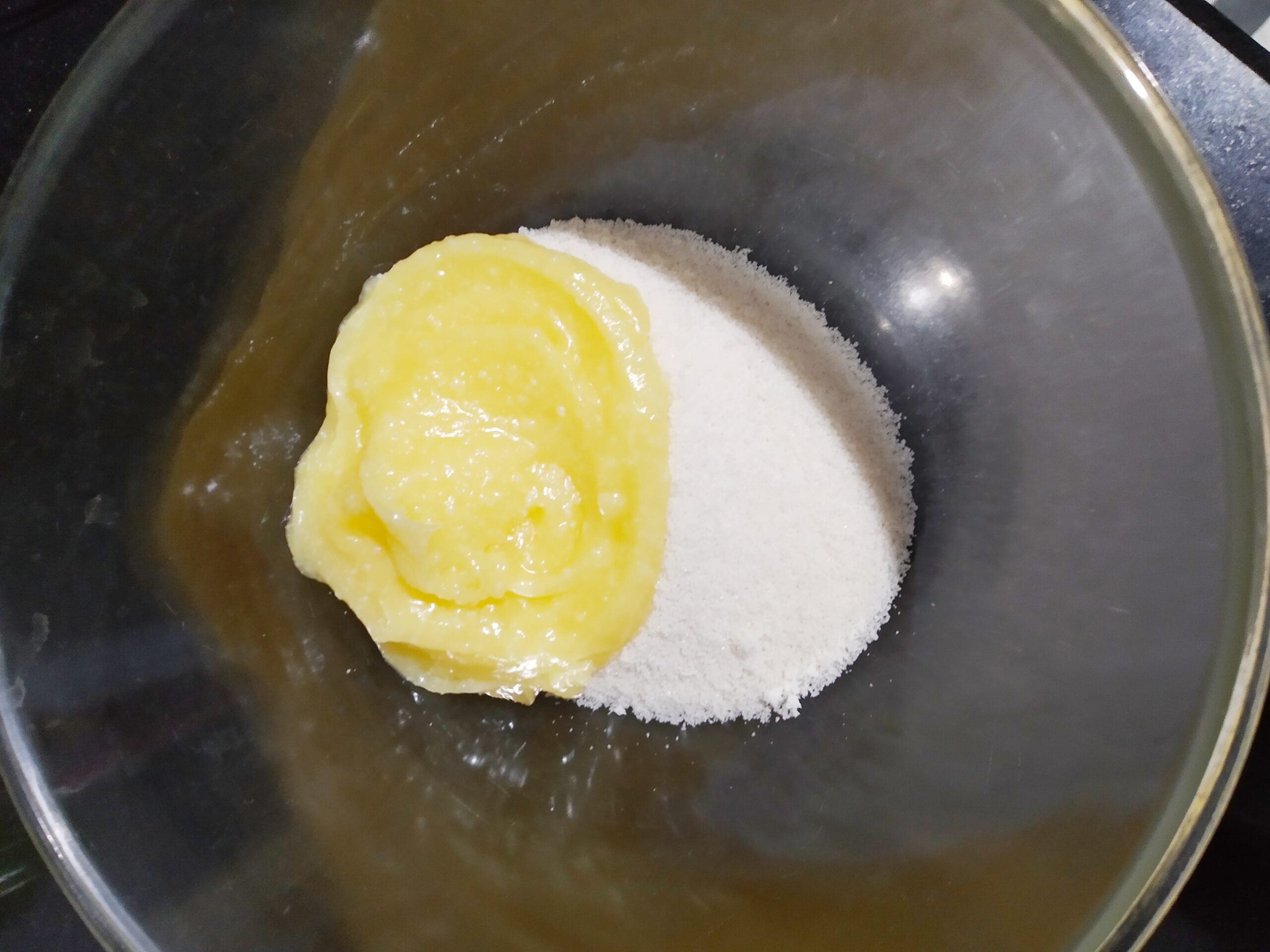 - Cream the ghee with the spoon, add the sugar and beat well until the mixture becomes smooth and light.