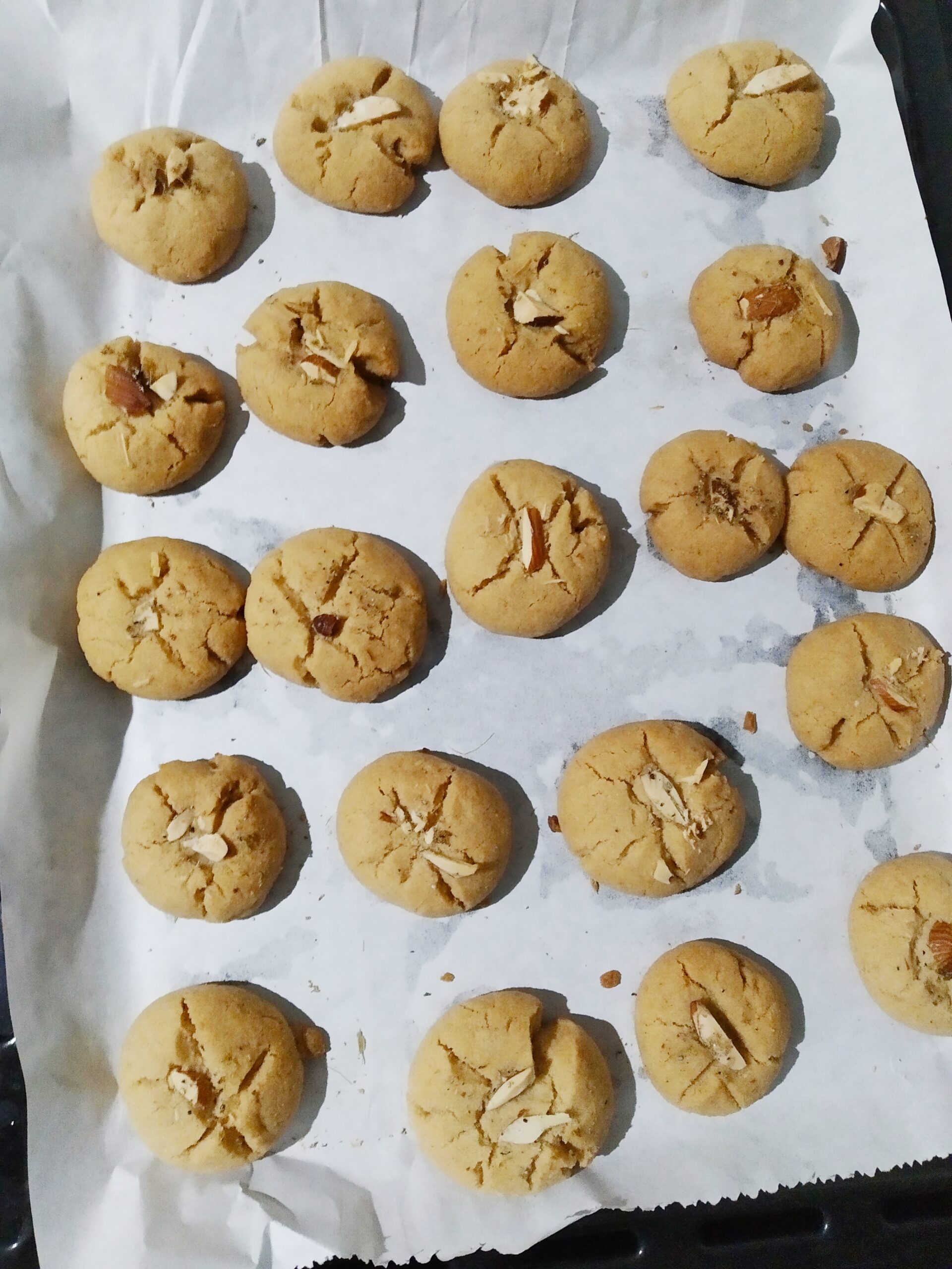 - Bake in the preheated oven at 180 degrees for 20 minutes until golden brownish. Keep them on the baking tray for 2-3 minutes, then shift them on a wired rack to and cool Store the Nankhatai in an airtight container.