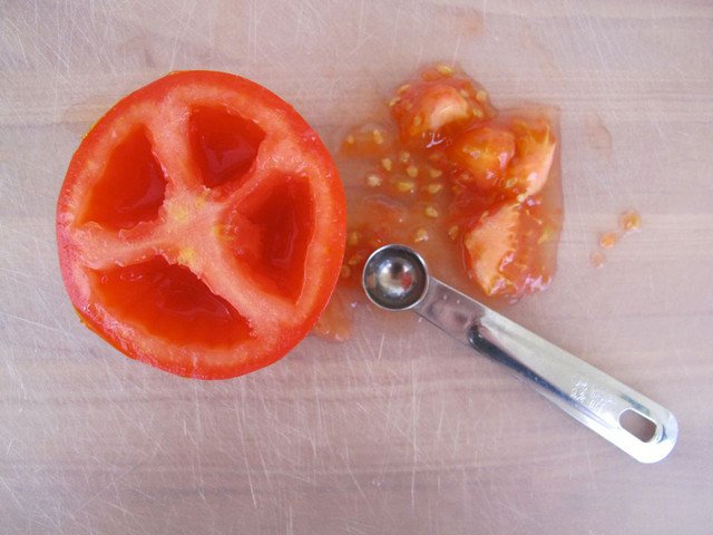 Cut the top of the tomatoes and scoop pulp to create a cavity. Keep tomato a side.